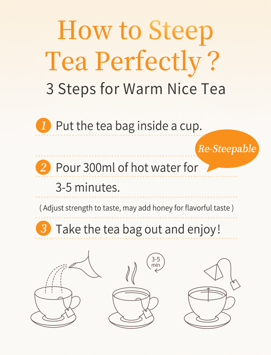 Steep tea bag in 200-300mL hot water for 3-5 minutes, then remove before serving. Adjust strength to taste. Can be re-steeped.