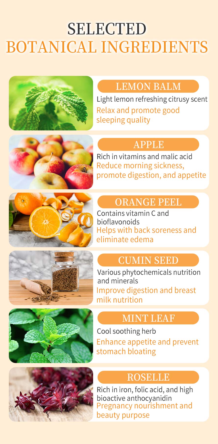 Lemon balm, apple, orange peel, cumin seed, mint leaf, and roselle.