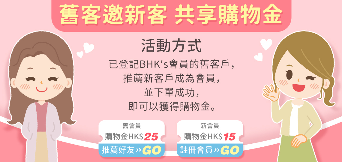 凡已登記BHK’s會員的舊客戶,推薦新客戶成為會員並下單且取貨成功後,即可以獲得購物金。